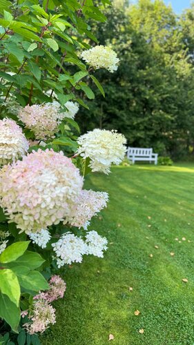 ◦ Большое ландшафтное пространство вдохновения, территория с аккуратными, мягкими зелёными газонами, прудом, цветущими растениями и раскидистыми деревьями